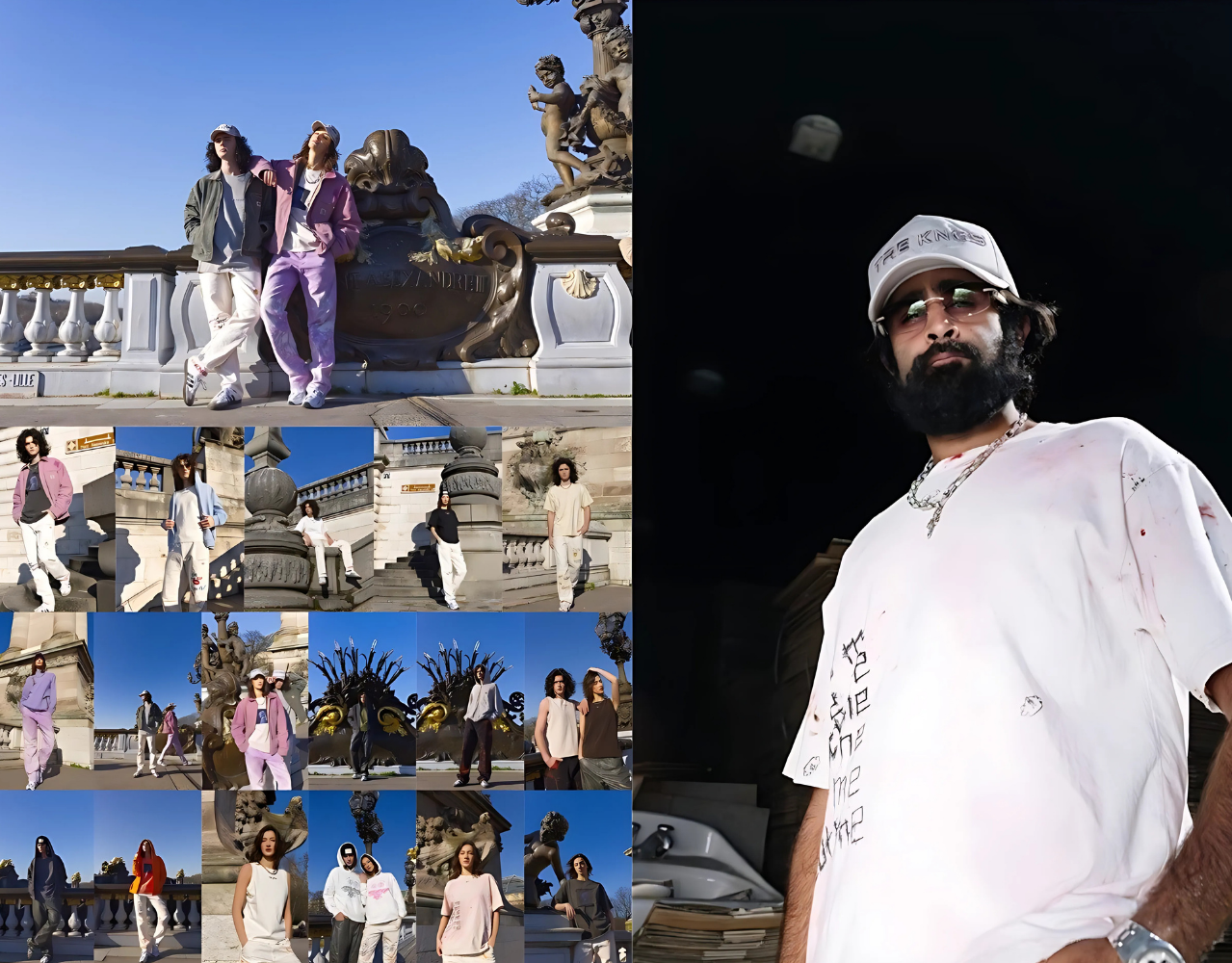 The location of the pictured shoot is on the Post Alexandre III bridge in Paris, set between the Champs-Elysees and the Eiffel Tower on the Seine river, the perfect backdrop to showcase the fusion of art and fashion. Throughout the course of one day, the Tre Kngs design team revolutionized the models. The lineup reveals all of the elements that have guided his aesthetic over the last two years. The creative director refers to the line as ‘beautiful items from a wardrobe’, which are designed to be worn again and again, transcending fashion trends: the adorned tank, edgy cargo pant, and worker jacket-all washed, painted, and distressed by the artist himself.