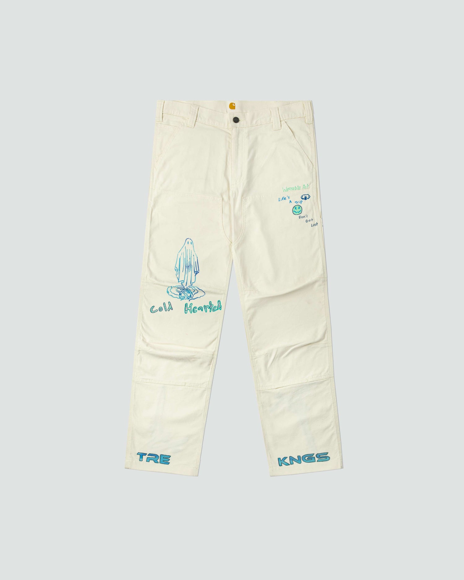 The location of the pictured shoot is on the Post Alexandre III bridge in Paris, set between the Champs-Elysees and the Eiffel Tower on the Seine river, the perfect backdrop to showcase the fusion of art and fashion. Throughout the course of one day, the Tre Kngs design team revolutionized the models. The lineup reveals all of the elements that have guided his aesthetic over the last two years. The creative director refers to the line as ‘beautiful items from a wardrobe’, which are designed to be worn again and again, transcending fashion trends: the adorned tank, edgy cargo pant, and worker jacket-all washed, painted, and distressed by the artist himself.